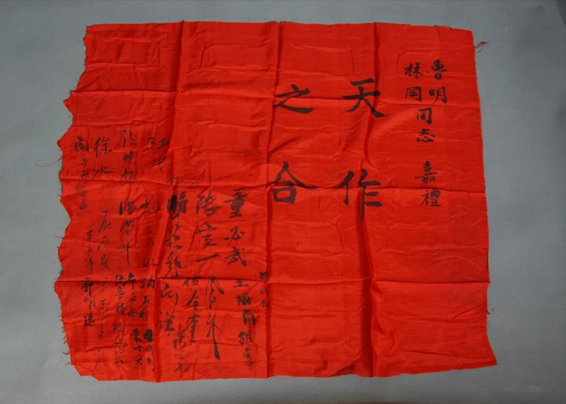 国共谈判破裂后,1947年3月,当国民党政府责令中共代表团工作人员限期返回延安时,时局已相当险恶,但鲁明、林冈夫妇对这条红绸却倍加珍惜,将它带回了延安,最后带到了北京,直到1986年工作人员去北京征集时仍保存完好。红绸贺礼体现了革命同志间真挚的友谊和大家庭的温暖。现为馆藏国家一级文物。