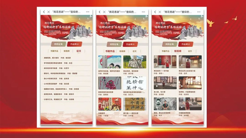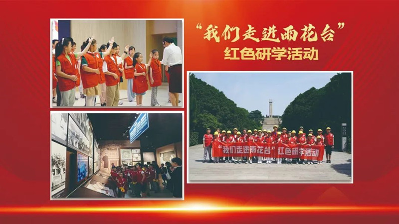 “我们走进雨花台”红色研学活动在暑期带领青少年走进雨花台,开展实地研学,让他们用脚步去丈量信仰的力量;在江苏广电总台荔枝新闻搭建融媒体平台,开设专栏,设立视频、绘画、征文等活动,联动市教育局和雨花台烈士纪念馆共同主办的“强国复兴有我 我是信仰传承人”作品征集活动,组织全市中小学生阅读《雨花英烈家书》《雨花英烈文集》,形成了强大的全媒体传播矩阵。截至目前,已累计收到 1100 余份投稿作品。