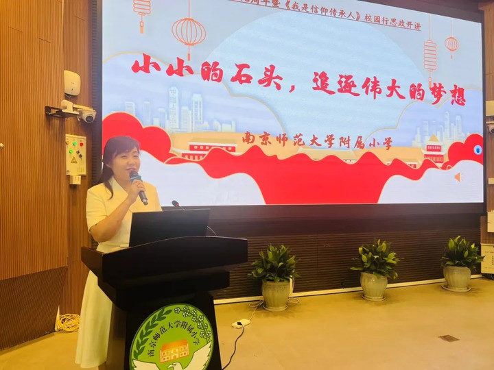 南京师范大学附属小学副校长姚梅在活动现场为同学们带来思政宣讲《小小的石头,追逐伟大的梦想》。从一块小小的雨花石,引入雨花英烈事迹与精神。我们每个人都是一块小小的,甚至毫不起眼的石头,但只要有梦想在,有努力进取的精神在,这块石头,迟早会筑起伟大中国梦!