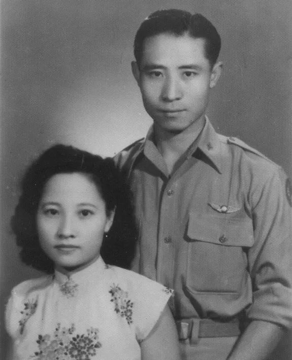 一位空军飞行员身穿军服站立在后,五官清秀、轮廓坚毅,面容秀丽的妻子则烫着时髦的卷发,穿着绣花的旗袍。怎么看,这都是一对让人称羡的眷侣。