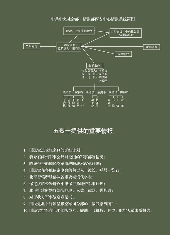 “北平五烈士”包括丁行、谢士炎、朱建国、孔繁蕤和赵良璋。谢士炎、丁行是将级军官,其他三位是校级军官,他们利用特殊身份,为党组织传递了很多绝密情报。